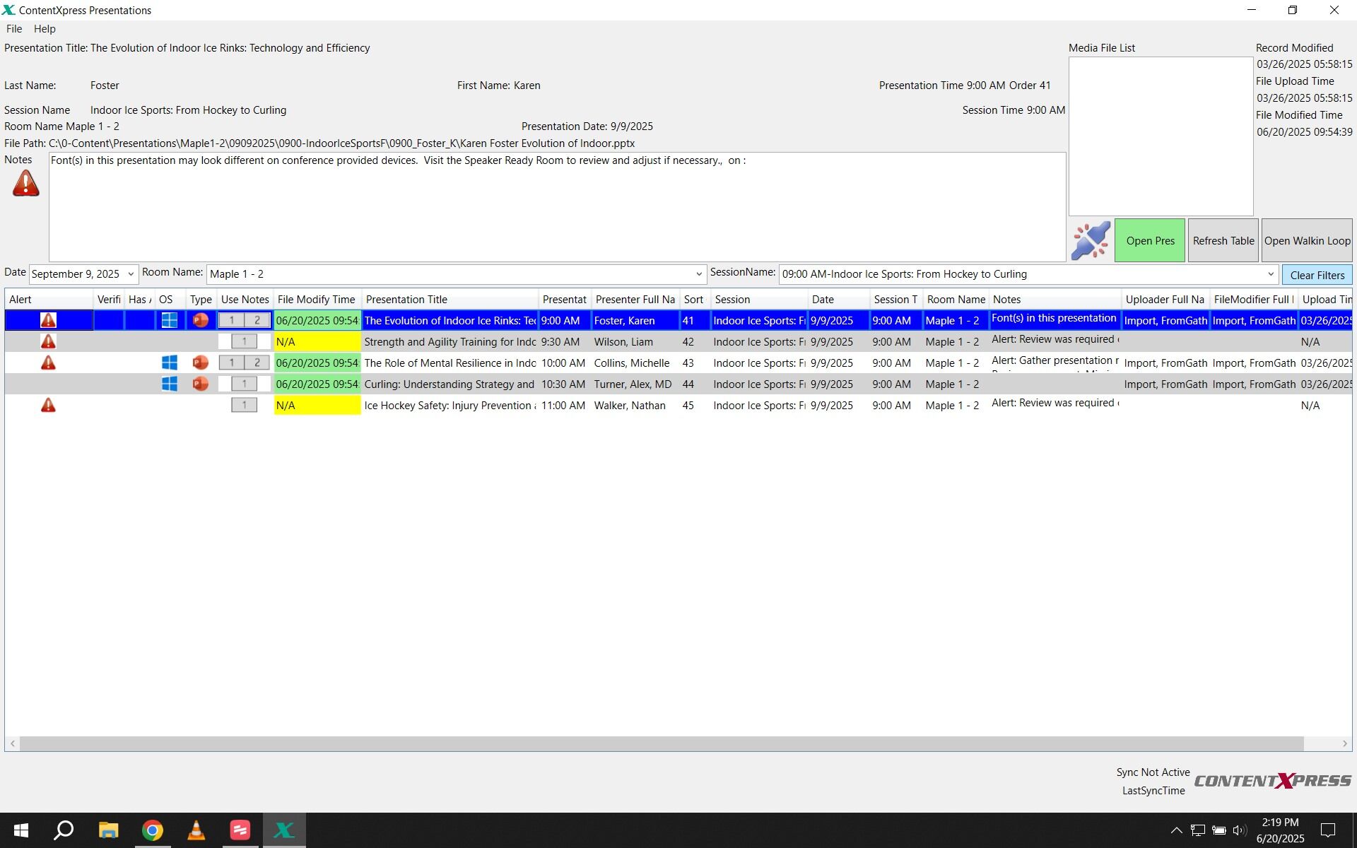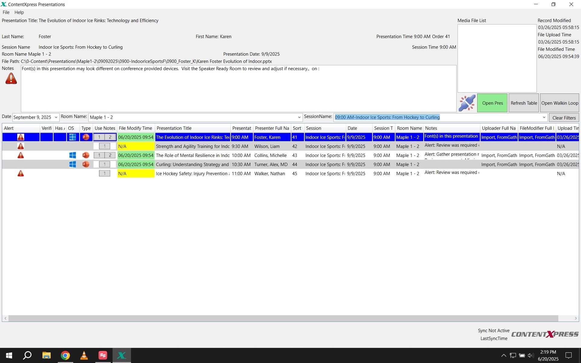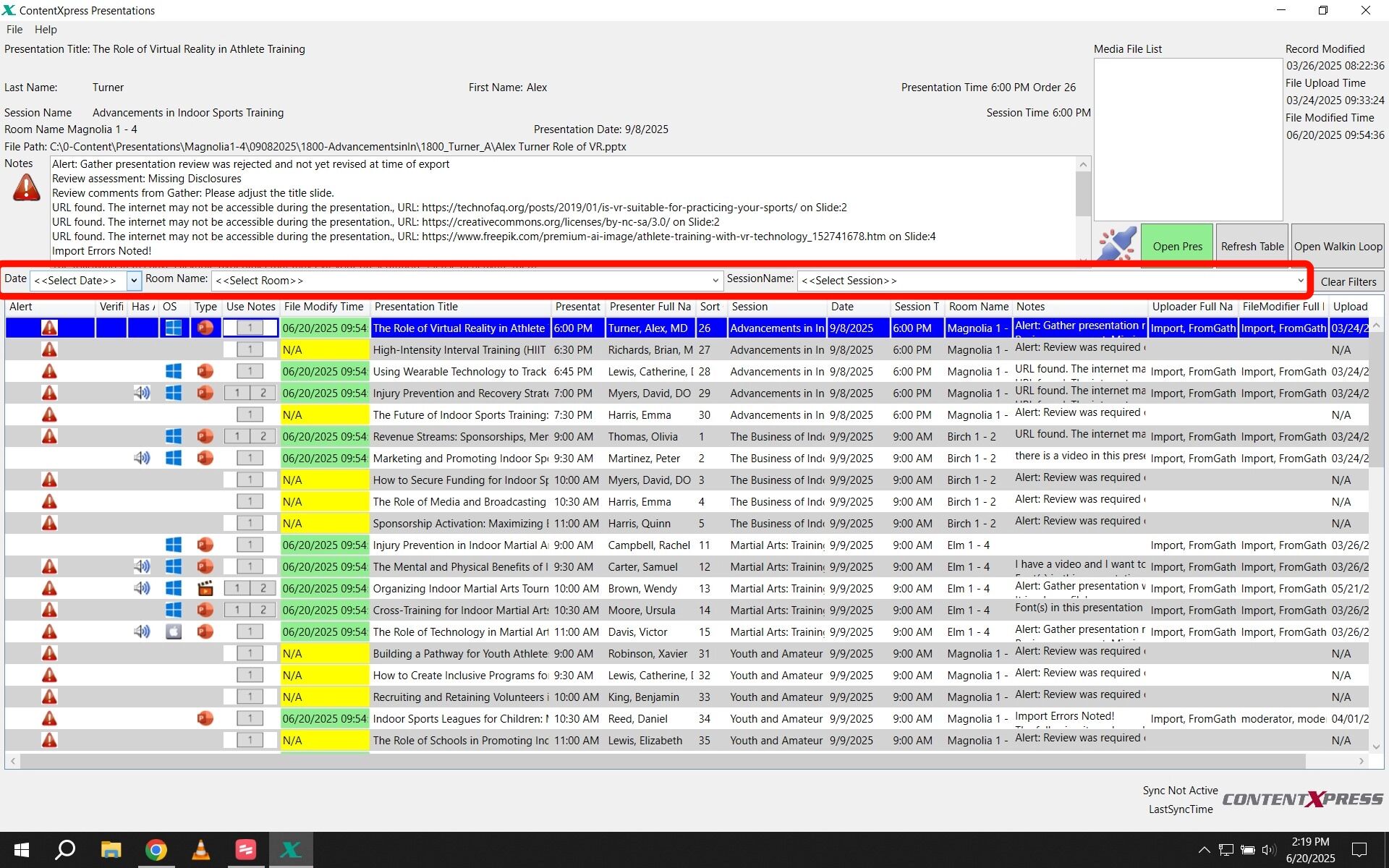 After logging in using Operator credentials, you’ll see a spreadsheet-style interface listing all sessions and presentations for the entire event.