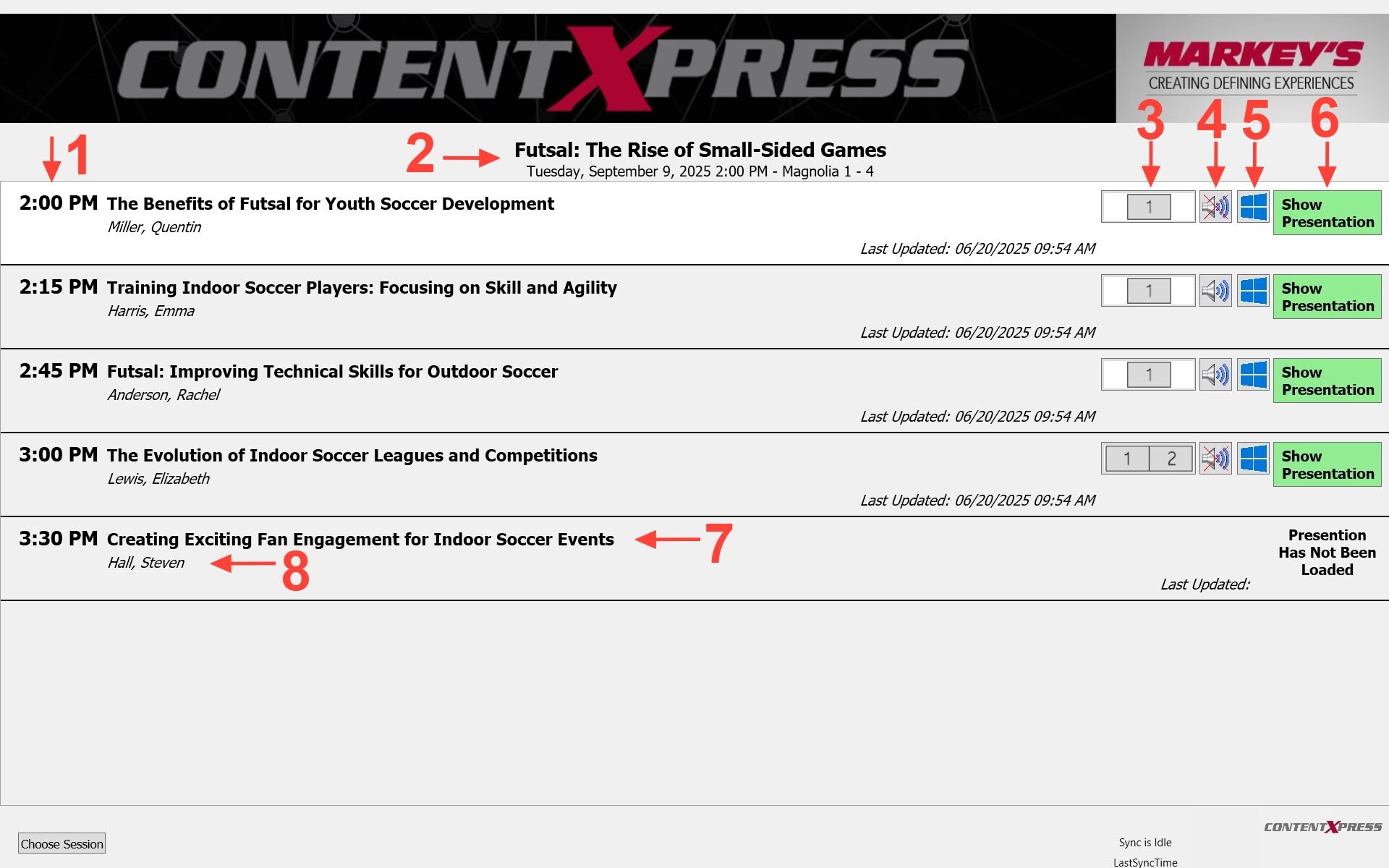 You’ll now see the main screen used to run slides for that session. To better understand the information and available tools, refer to the red numbered indicators (1–8) on the screen. Here's what each number represents: