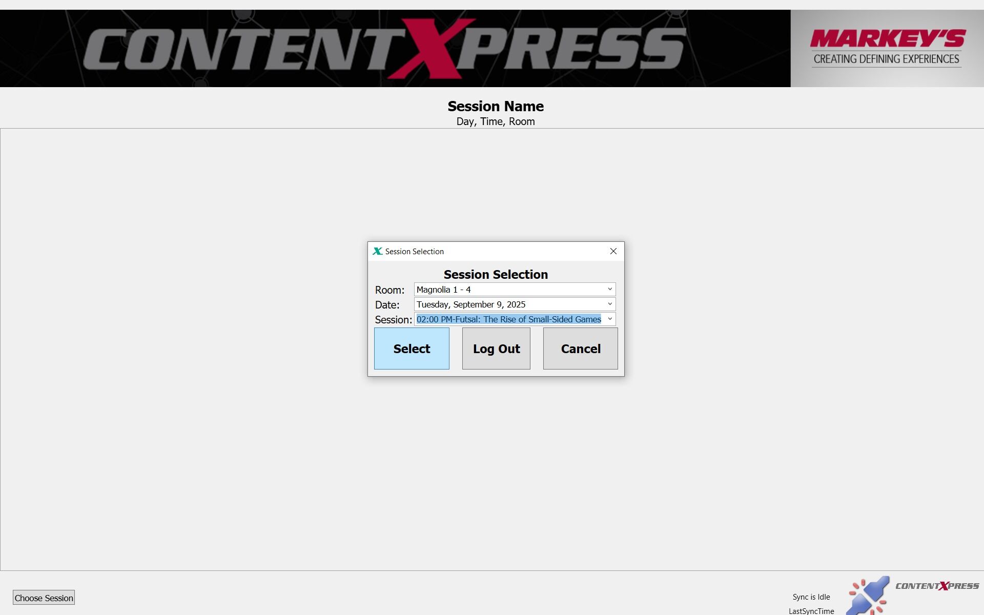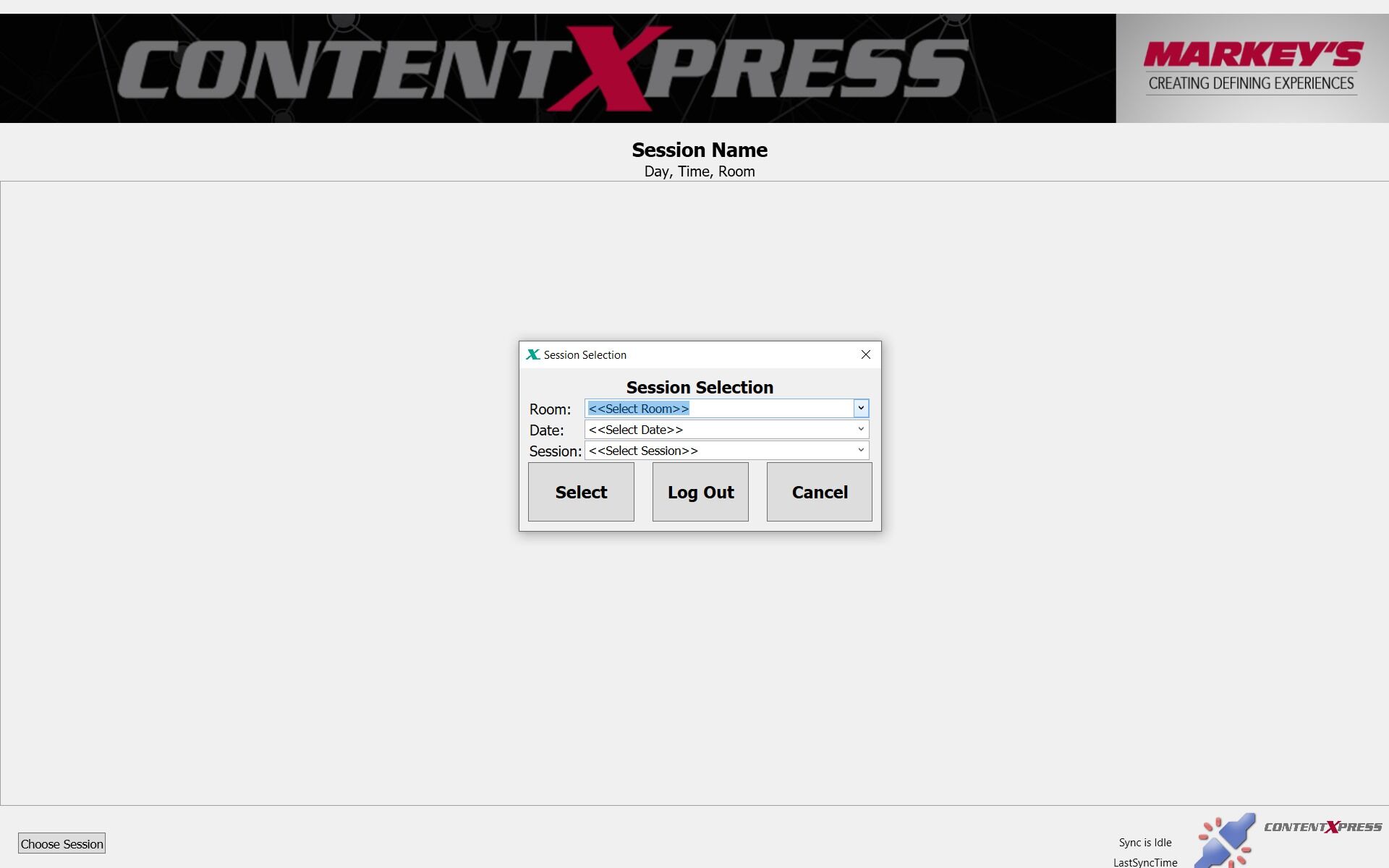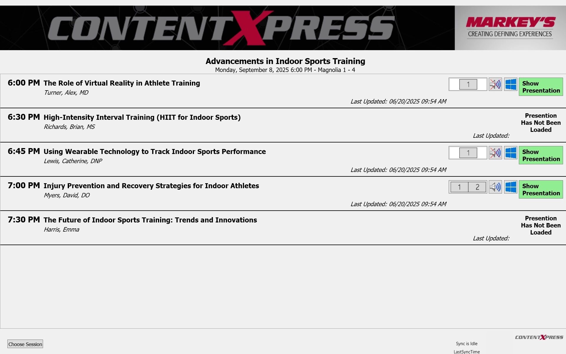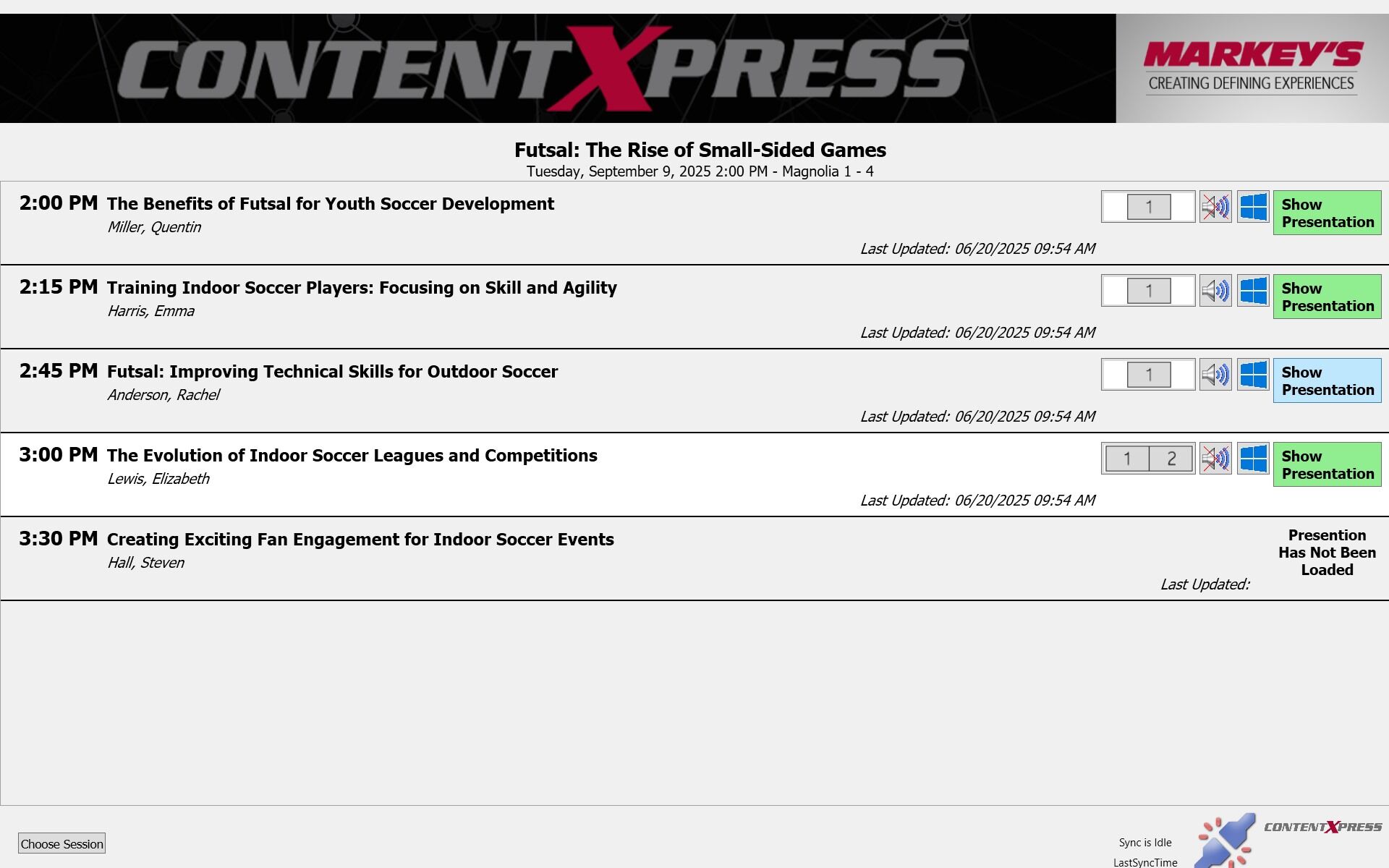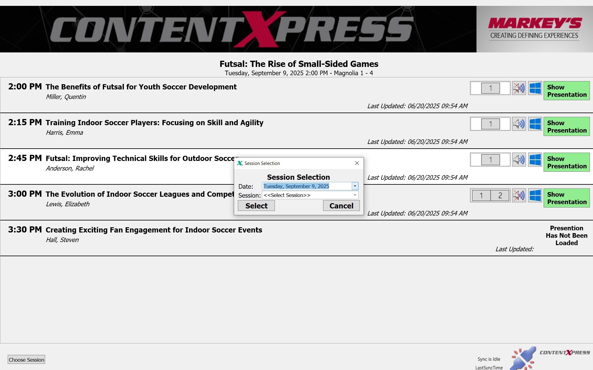 If you have a speaker needing to load last minute you can load a session through moderator view. Do this by holding control and then double clocking either "Show Presentation" or "Presentation has not been loaded" depending on what is there. This will go through the upload wizard that will also send the file back to the ContentXpress server.