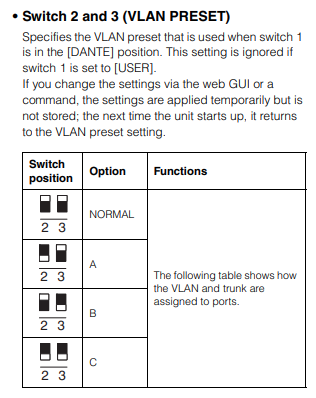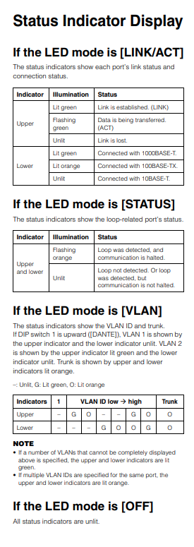 LED Status Indicators, VLAN Settings, and Dip Switch Modes